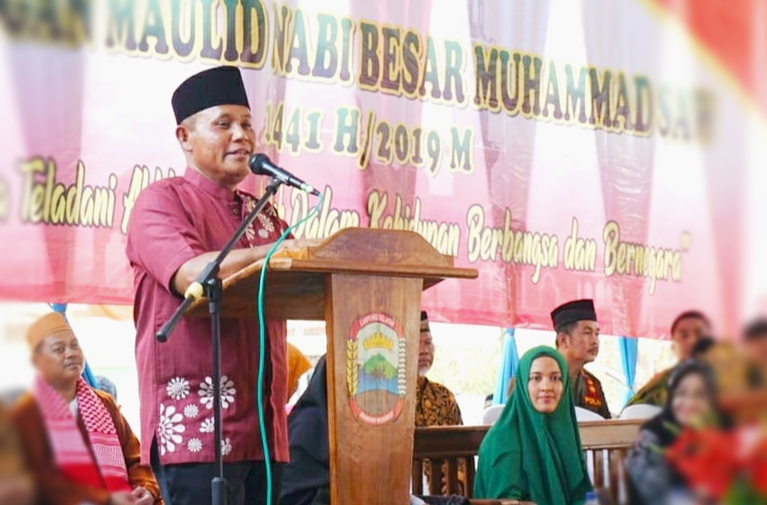 LAMPUNG SELATAN — Pelaksana tugas (Plt) Bupati Lampung Selatan H. Nanang Ermanto menghadiri peringatan Maulid Nabi Muhammad SAW 1441 Hijriah di Halaman Masjid Baitul Iman, Desa Hargosari II Jogya, Kecamatan Merbau Mataram, Kamis (21/11/2019) siang.