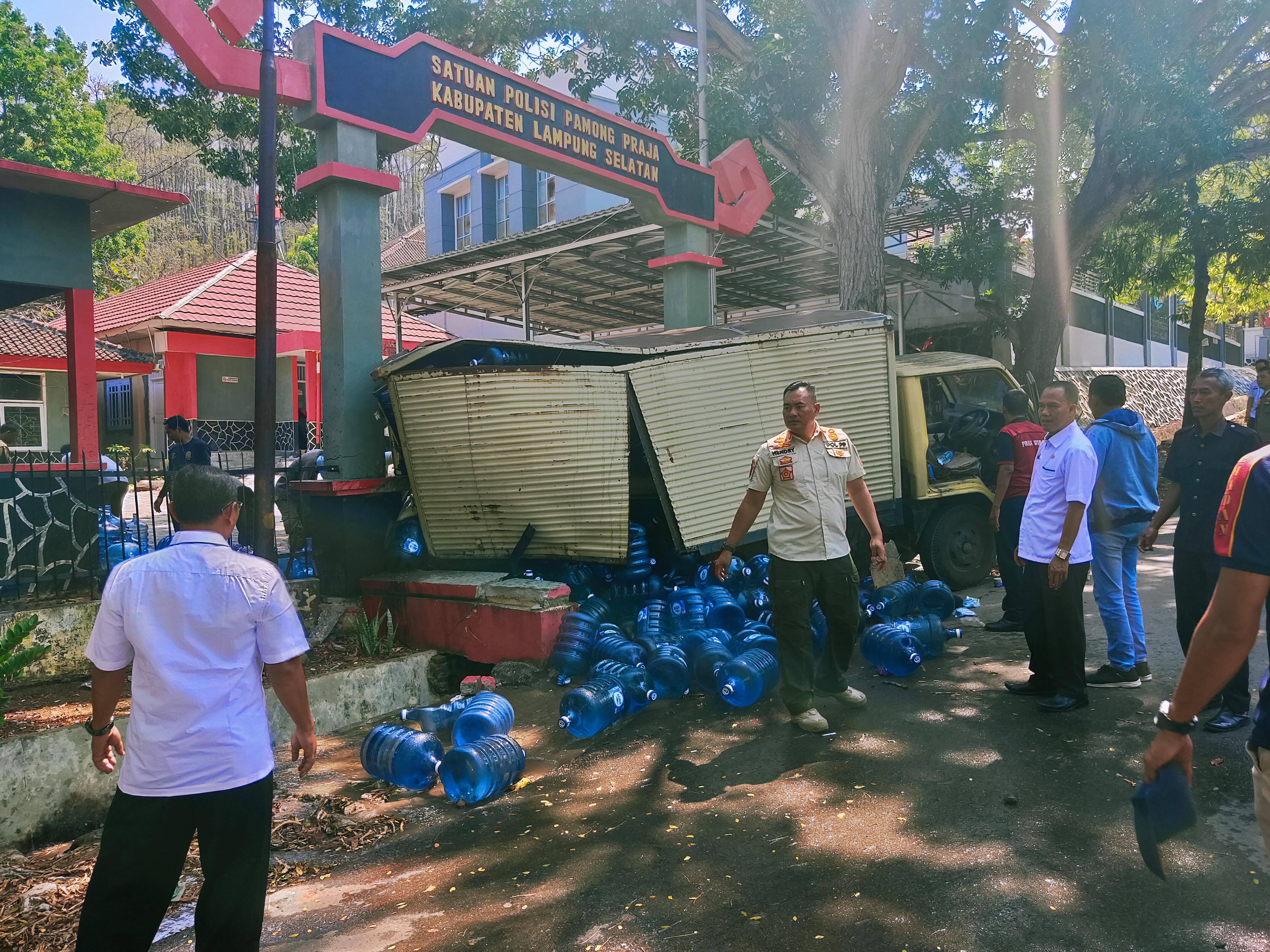 KALIANDA – Truk boks bernomor polisi BE 9049 AN bermuatan galon harian tabrak mundur di kawasan perkantoran pemerintahan Lampung Selatan, Rabu (20/11/2019)