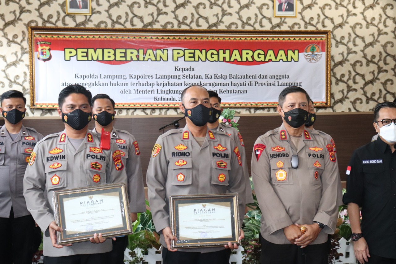 Lampung Selatan — Kementerian Lingkungan Hidup dan Kehutanan Republik Indonesia (KLHK-RI), melalui Ditjen Gakum KLHK – RI, memberikan penghargaan kepada Kapolda Lampung Irjen. Pol. Drs. Hendro Sugiatno, MM, Kapolres Lampung Selatan AKBP. Edwin, SH, SIK, MSi dan Kepala Kepolisian Sektor Kawasan Pelabuhan (KSKP) Bakauheni Lampung Selatan Rhido Rafika, SH, MM beserta anggota, atas peran aktif melakukan penegakkan hukum, terhadap kejahatan keanekaragaman hayati di Provinsi Lampung.