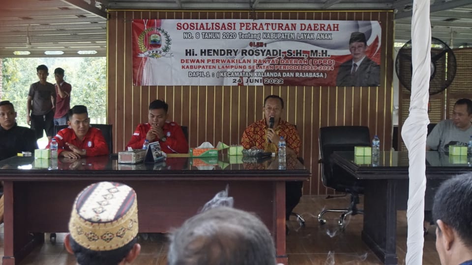 Lampung Selatan – Ketua DPRD Kabupaten Lampung Selatan (Lamsel), H. Hendry Rosyadi, SH, MH, menggelar Sosialisasi Perda (Sosper) No. 8 Tahun 2020 Tentang Kabupaten Layak Anak.