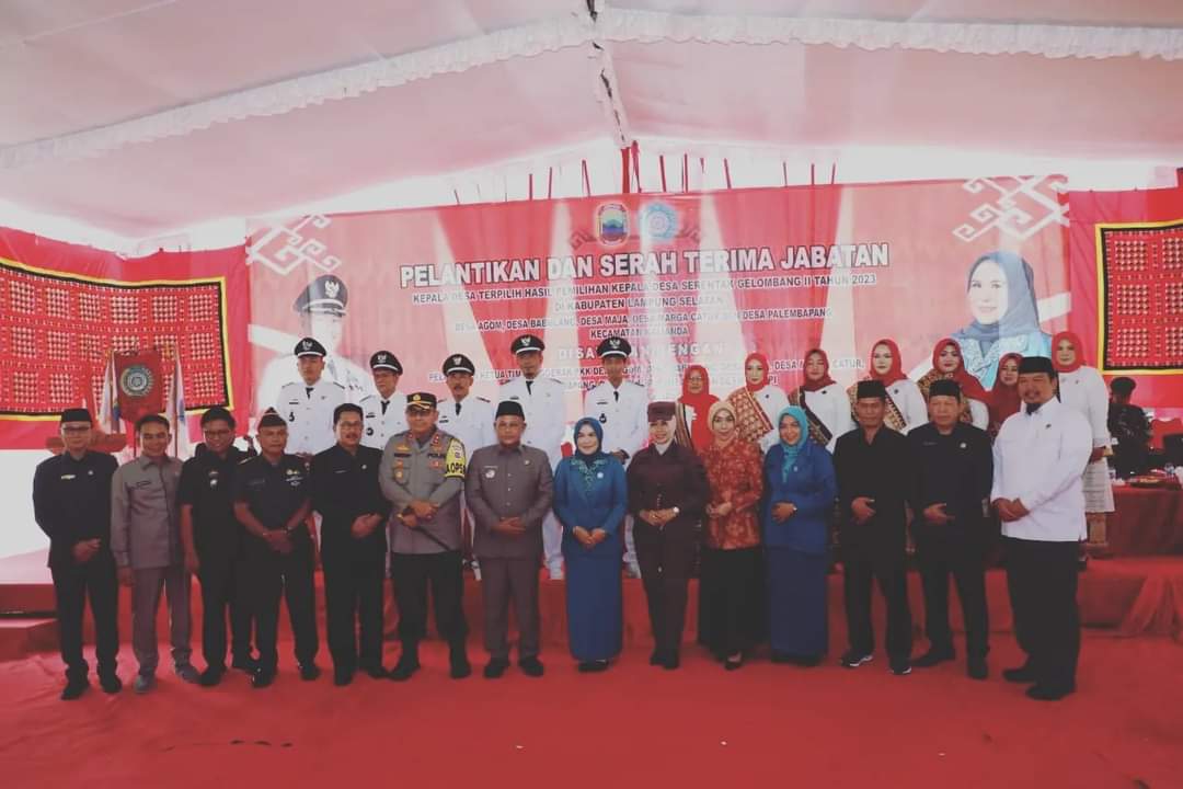LAMPUNG SELATAN–Bupati Lampung Selatan H. Nanang Ermanto kembali melantik dan mengambil sumpah kepala desa terpilih hasil Pemilihan Kepala Desa (Pilkades) serentak gelombang II tahun 2023 yang dipusatkan di Lapangan Desa Palembapang, Kecamatan Kalianda, pada Kamis (7/9/2023).