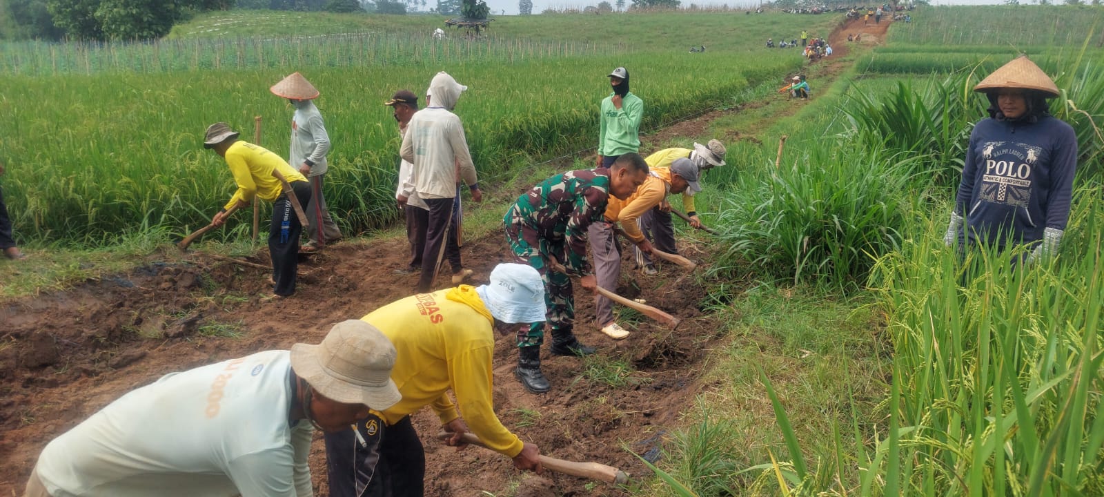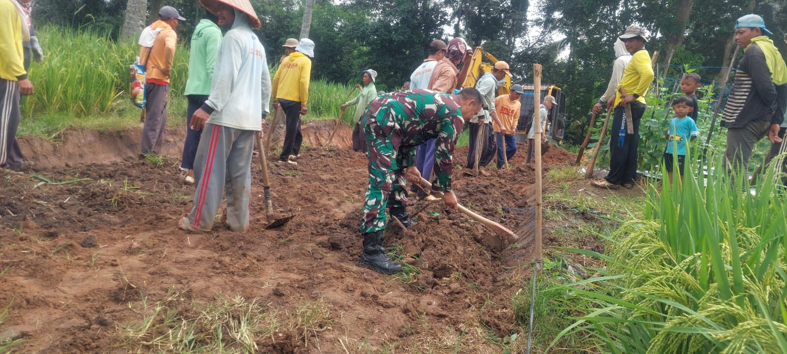 Untuk memudahkan akses dan aktivitas masyarakat dalam pertanian, Babinsa Koramil 421-06/Natar, Kodim 0421/Lamsel, Serka Anton Apriadi menyemangati warga masyarakat melaksanakan kegiatan karya bakti gotong royong pembuatan Badan Jalan ke area persawahan yang berlokasi di Dusun Panggung Sari, Desa Margorejo, Kecamatan Tegineneng, Kabupaten Pesawaran, Rabu (09/07/2025).