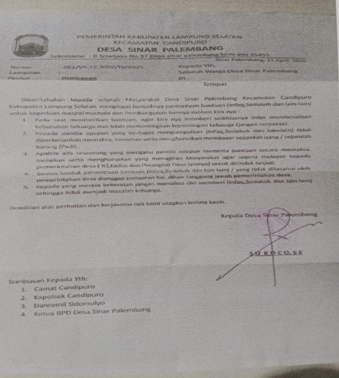 Kepada yang terhormat seluruh Warga Desa Sinar Palembang. Diberitahukan kepada seluruh Masyarakat Desa Sinar Palembang Kecamatan Candipuro Kabupaten Lampung Selatan, mengingat banyaknya permintaan bantuan [Infaq, Sodakoh dan lain-lain) untuk keperluan masjid/mushola dan pembangunan lainnya.