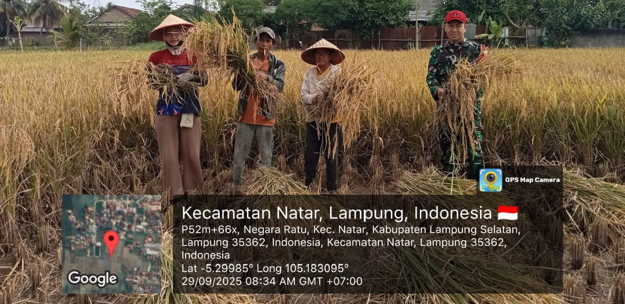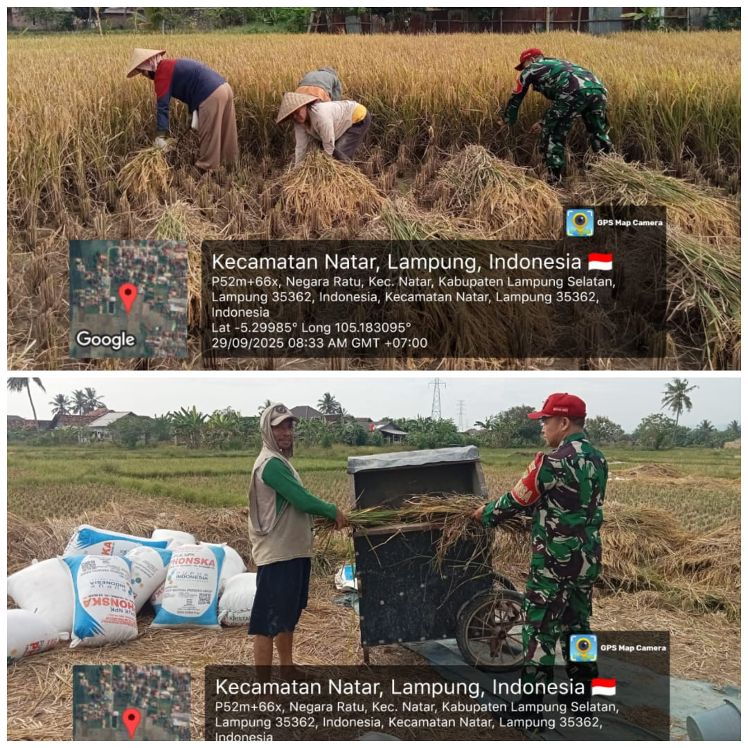 Babinsa Koramil 421-06/Natar, Kodim 0421/Lamsel, Serka Ayatul Komini turun ke sawah melaksanakan pendampingan membantu petani binaan panen padi milik Bapak Saimun 55 tahun dengan luas lahan 4 Hektar, Jenis Varietes IR 32 (Infari 32) petani Desa Negara Ratu, Kecamatan Natar, Kabupaten Lampung Selatan, Senin (29/09/2025).