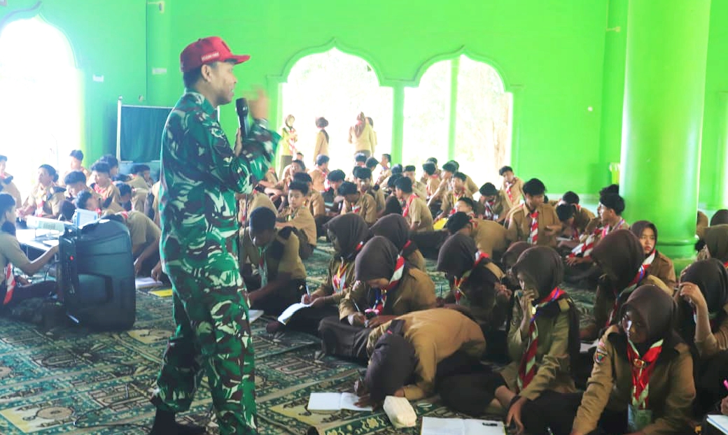 Babinsa Koramil 421-06/Natar, Kodim 0421/Lamsel, Serka Ayatul Komini, memberikan Materi Pembekalan dan Pengetahuan tentang Wasbang dan Empat Pilar Kebangsaan Kepada anak-anak Pramuka Siswa Siswi SMA Swadhipa Natar dengan mengambil tempat di Masjid Taq’wa Komplek SMA Swadhipa Natar Desa Bumi Sari, Kecamatan Natar, Kabupaten Lampung Selatan, Senin (20/10/2025).