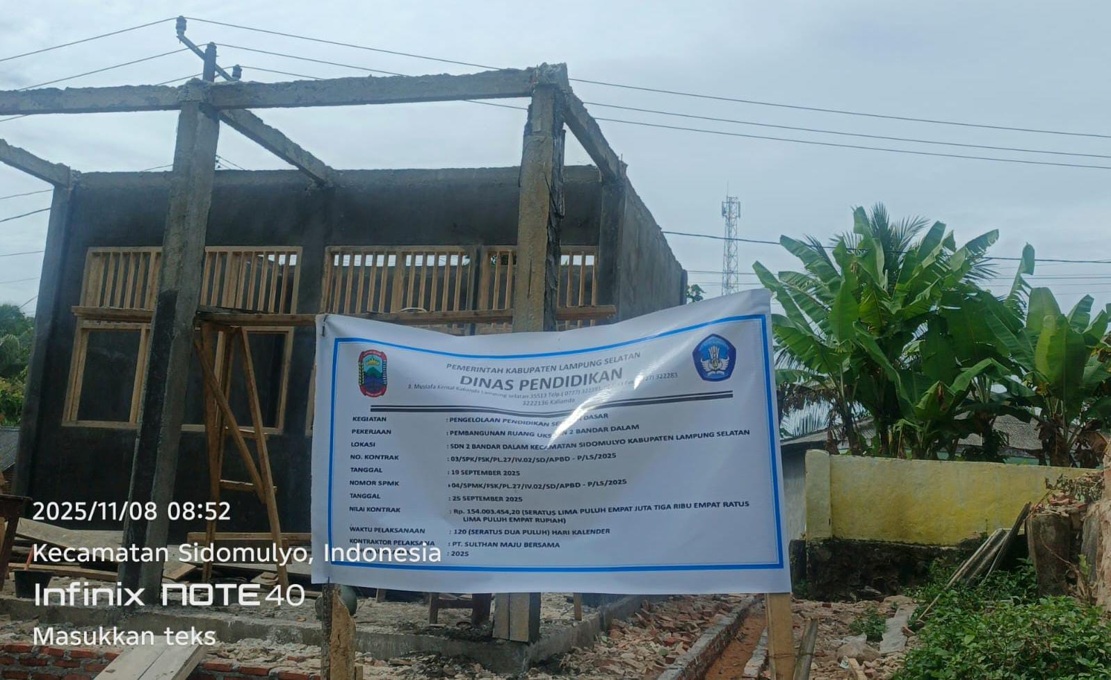 Proyek yang dikerjakan oleh PT. Sulthan Maju Bersama ini menggunakan anggaran sebesar Rp 154.003.454,20, dari Dinas Pendidikan Kabupaten Lampung Selatan. Berdasarkan dokumen resmi, pekerjaan dilaksanakan melalui Kontrak Nomor 03/SPK/FSK/PL.27/IV.02/SD/APBD–P/LS/2025 yang ditandatangani pada 19 September 2025. Adapun SPMK Nomor 04/SPMK/FSK/PL.27/IV.02/SD/APBD–P/LS/2025 terbit pada 25 September 2025, dengan waktu pelaksanaan 120 hari kalender.