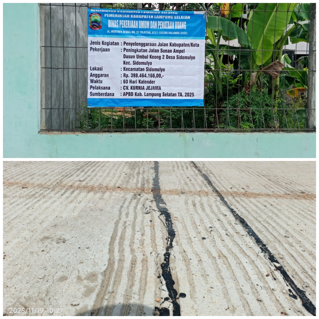 Proyek yang dikerjakan oleh CV. Kurnia Jejama dengan nilai anggaran Rp 398.464.166 dan bersumber dari APBD Kabupaten Lampung Selatan TA 2025 ini kini menjadi sorotan warga.