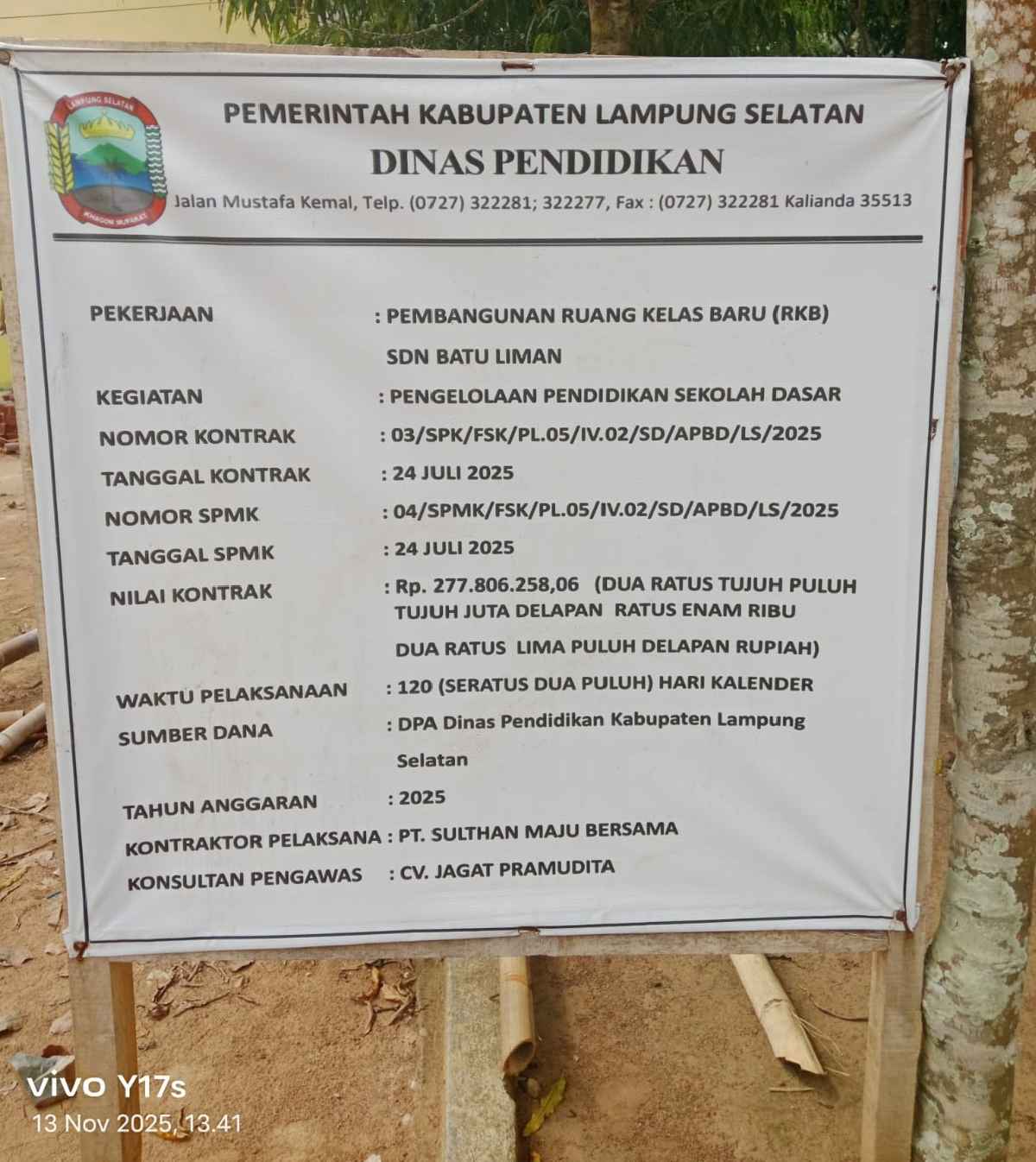 Berdasarkan data resmi pada papan proyek, pekerjaan ini bernilai Rp 277.806.258,06 atau hampir Rp 278 juta, dengan sumber dana DPA Dinas Pendidikan Kabupaten Lampung Selatan. Proyek dimulai melalui kontrak pada 24 Juli 2025, dengan waktu pelaksanaan 120 hari kalender.